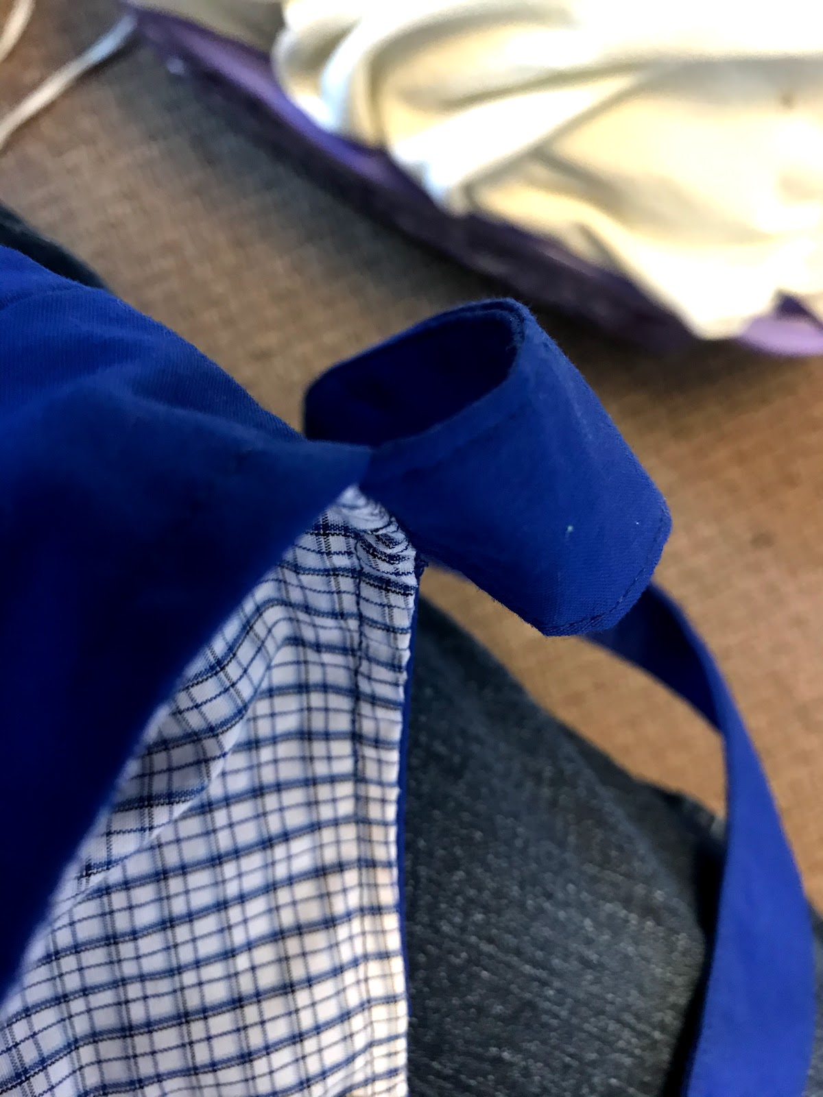 DGD wanted a purse for her dress up box. I found a buttercup purse pattern online and in two sizes. I decided to make the smaller size. For the outer layer I used some left over from the dress up clothes I made her for Christmas. Than for the lining I repurposed a dress shirt of DH. It when through the wash unfortunately with a red top by accident. Unable to get the dye out after a few tries DH was going to just throw it out. Before doing so I was able to cut out the lining.